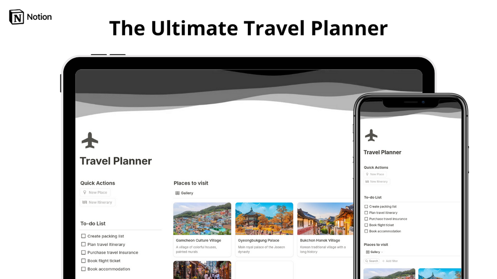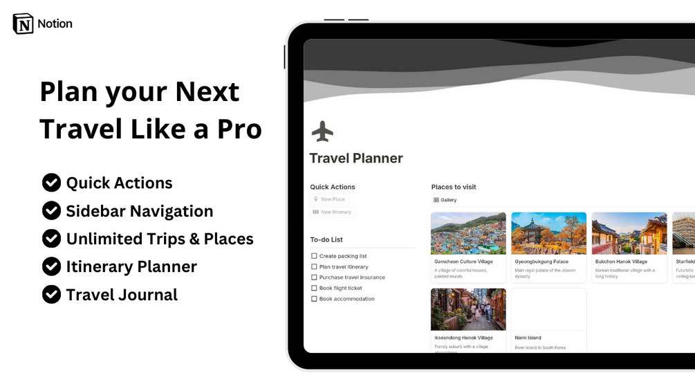 This all-in-one Notion template takes the stress out of travel planning. Designed for travelers who want an effortless way to organize their trips, it helps you stay on top of your itineraries, expenses, and travel essentials.